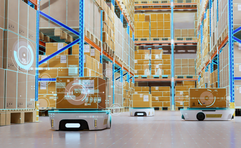Automatisierte selbst fahrende Fahrzeuge als verbindende Materialflusslösung. Das Fahren erfolgt entweder komplett schienenfrei über definierte Spuren oder Marker (AGV) oder über das freie Navigieren mit automat. dynamischen Ausweichen von Hindernissen (AMR).