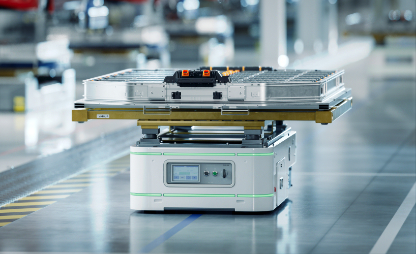 Automatisierte selbst fahrende Fahrzeuge als verbindende Materialflusslösung. Das Fahren erfolgt entweder komplett schienenfrei über definierte Spuren oder Marker (AGV) oder über das freie Navigieren mit automat. dynamischen Ausweichen von Hindernissen (AMR).