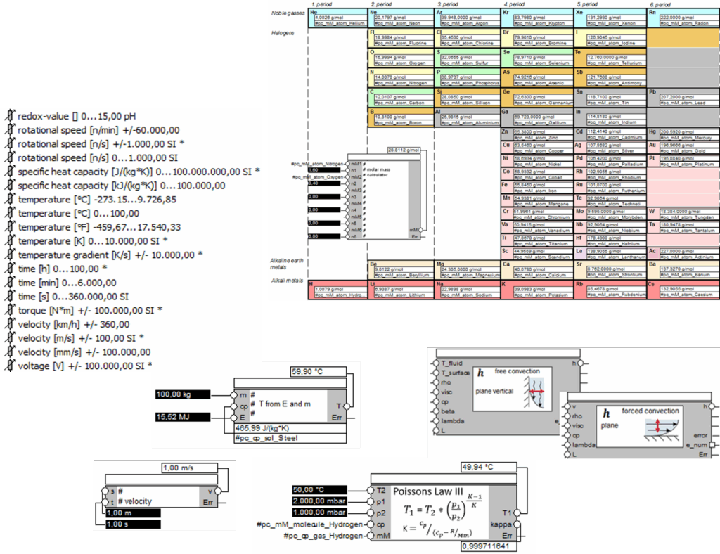 - Konstanten stellt physikalische Konstanten und Materialeigenschaften – von Dichte bis Wärmekapazität – sowie zugehörige Formeln und Berechnungsmethoden zur Verfügung.