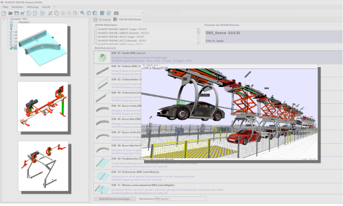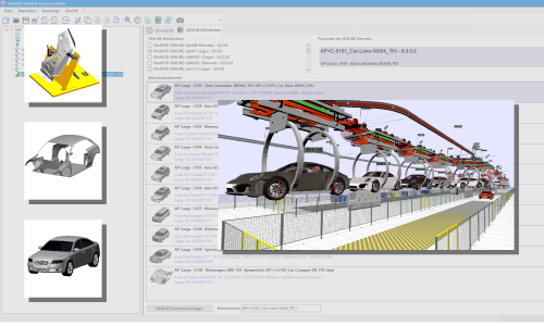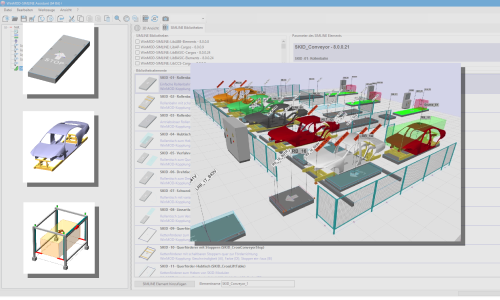 Die WinMOD-SIMLINE Bibliothek SKID Fördertechnik (SKID) ist speziell für den Automobilbau konzipiert und ermöglicht es alle Bereiche, angefangen bei der verbindenden Fördertechnik im Karosseriebau über Lackierstraßen bis hin zu komplexen MAT-Strecken und Sortierspeichern als WinMOD-SIMLINE Anlage zu erstellen. Die Bibliothek beinhaltet einfache Rollenbahnen, Umsetzer-Kombinationen, Gliederförderbänder, Leer-SKID Dispenser und Lineareinheiten mit Handlings-Funktionen. Alle Elemente sind komplett parametrierbar und kombinierbar. Von der ersten Rohbaukarosse bis hin zum fertigen Auto können alle Förderprozesse und Prozessübergänge in WinMOD-SIMLINE realisiert werden. Eine umfangreiche Anzahl an typischen SKID-Modulen und Standard-Karosserien ermöglicht den sofortigen Start einer WinMOD-SIMLINE Anlage ohne auf 3D-CAD-Daten warten zu müssen. Wenn es nötig ist können aber jederzeit individuelle CAD-basierte SKID-Module integriert werden. Somit ist die geometriegenaue Sensorerfassung gerade bei MAT-Anlagen sicher.