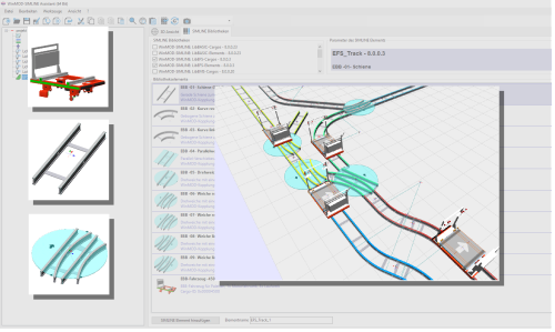Die WinMOD-SIMLINE Bibliothek Elektrobodenbahn (EBB) beinhaltet alle nötigen Elemente, um vorgegebene Schienen-Layouts als WinMOD-SIMLINE Anlage zu generieren. Die Doppelbodenschienen mit Geraden, Kurven und Weichen werden konstruktiv und funktional parametriert. Standard- und herstellerspezifische Fahrzeuge können individuell virtualisiert werden. Mit der klassischen WinMOD-SIMLINE Fördertechnik kann dann die nötige “OnBoard“-Technik wie Rollen- oder Kettenförderer sowie Sensoren auf die Fahrzeuge verbaut werden. Die Schienen- und Codebandkommunikation ermöglicht es jeden realen EBB-Anlagentyp zu simulieren.