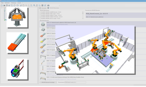 Die Bibliothek ROB beinhaltet Elemente wie zum Beispiel 6 Achs-Knickarm-Roboter, Greifrahmen, Lineareinheiten, Spannvorrichtungen etc.